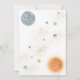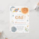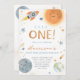 Inbjudan har rymddesign, sol, måne, raketer, stjärnor och jordjord. Perfekt för ett första födelsedagstema.