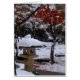 En japansk trädgård efter årets första snö. En chock av röd momiji står ut mot det vita snö.