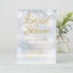 Mjuka snöflingor faller över din bröllopsdusch detaljer, satta i elegant guldbokstäver på en magisk vinterbakgrund, denna chic bröllopsdusch inbjudan är idealisk för din speciella bröllopsdusch.