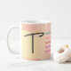 Mugg kommer att vara en favorit för alla från din mormor till din tonårssyster. Med högernas budskap kan ett mugg bli någons skattade följeslagare till komen i åratal. Den här designen har en vacker, handdragen brev-T i svart kursiv stil på en fantastisk vattenfärgsbakgrund. Den lämnat sidan visar en varm övertoning mellan gult och rosa, medan högerna visningar en mjuk övertoning mellan rosa och gult. Området kring brev är vibrerande ord i olika färg, inklusive blått, orange, rött, lila och rosa, vilket belyser positiva egenskaper som börjar med brev "T". Den övergripande effekten är en visuellt tilltalande och upplyftande design som firar skönheten hos brev "T" och dess egenskaper. Vattenfärgsbakgrunden tillför en smula elegans och sofistikering och skapar den här perfekten för inspiration eller motivation.