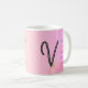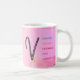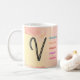 Mugg kommer att vara en favorit för alla från din mormor till din tonårssyster. Med högernas budskap kan ett mugg bli någons skattade följeslagare till komen i åratal. Den här designen har en vacker, handdragen "V" från brev i svart kursiv stil på en fantastisk vattenfärgsbakgrund. Den lämnat sidan visar en varm övertoning mellan gult och rosa, medan högerna visningar en mjuk övertoning mellan rosa och gult. Området kring brev är vibrerande ord i olika färg, inklusive blått, orange, rött, lila och rosa, vilket belyser positiva egenskaper som börjar med brev V. Den övergripande effekten är en visuellt tilltalande och upplyftande design som firar skönheten hos brev V och dess egenskaper. Vattenfärgsbakgrunden tillför en smula elegans och sofistikering och skapar den här perfekten för inspiration eller motivation.