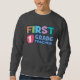 Den här söta, regnbågsvänliga t-shirt-designen firar lärare och läser: "Första Klassen-läraren" i en roligt, barnvänlig stil. Design innehåller ett äpple med nummer 1 inuti. Enkelt att anpassa. Välj t-shirt-stil eller lägg till text för en personlig. Gör en underbarare Back to school Gift.