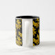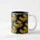 Detta dekorativa mugg har en abstrakt mönster av guldblommor av gult. Forsytias är en av de tidigaste blomstrande shruberna i vår. När den här blomman visar sina lysande guld-petaler i trädgården vet vi att vintern är borta i ytterligare ett år. Här står de på en rent svart bakgrund.