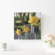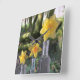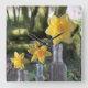 Tre ljusa gult- och orange-daffodils av olika arter hålls i tre vintagar i British flaskor, med en gammal romersk väg, Fosse Way, som bakgrund.