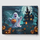 Förtjusande Halloween-designer. Lite, vänligt spöke genom mörken, mystisk kväll. Spöket har en mjuk, ljusvit och har ett eländigt leende som skapar en välkomnande atmosfär. Runt honom lyser små stjärnor gnistran i himmel och måne i en mjuk ton. Pumpkins kastar milda skuggor på marken, ge utformningen av en varm, autolog stämning.