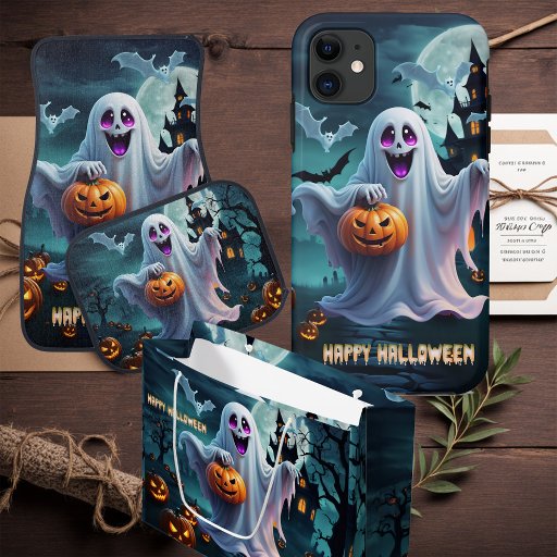 Förtjusande Halloween-designer. Lite, vänligt spöke genom mörken, mystisk kväll. Spöket har en mjuk, ljusvit och har ett eländigt leende som skapar en välkomnande atmosfär. Runt honom lyser små stjärnor gnistran i himmel och måne i en mjuk ton. Pumpkins kastar milda skuggor på marken, ge utformningen av en varm, autolog stämning.