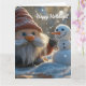 En charmig vinterscen med en söt tomte i röd hatt och en liten snöman, omgiven av lätt fallande snö. Den lekfulla duon sitter i ett snötäckt landskap, med gyllene höstlöv i bakgrunden som ger värme till vinterstämningen.