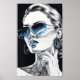 Denna djärva och snyggt illustration har en trygg, modern kvinna som är försedd med stora solglasögon, chic ring örhängen och ett pulserande blått läppar. Den minimalistiska svartvita skissen accentueras med skarpa blåtoner, vilket skapar en känsla av contemporaryns elegans och coola. Perfekt för mode framåt-ytor, den här teckningen firar självuttryck och tidlös stil med en aning stadsluft.