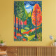 En sjudande linocut-utskrift i en folkkonst stil inspirerad av Marc Chagall, som skildrar en viskös skogsscen. Fantastiskt träd, pulserande färg och lekfulla detaljer framkallar en känsla av magi och .