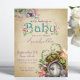 Den här magiska och visuella inbjudan till babyduschen innehåller ett förtrollat skogstema. En bild av en älvdörr i en liten svampträdgård placeras vid grund, med en fjäder ovanför den. Bakgrunden är en vintage stil, ett fäste pappra mönster.