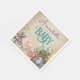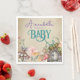 De här magiska och vismiska babyduschservetterna har ett förtrollat skogstema. En bild av en älvdörr i en liten svampträdgård placeras vid grund, med en fjäder ovanför den. Olika blommor och svampar placeras längs grund. Bakgrunden är en vintage stil, ett fäste pappra mönster.