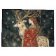 Konsten skildrar en förtjusande scen med en kvinna klädd i en ornat, krimson cloak försedd med guldfärgad mönster. Hennes långa bruna hår är elegant formaterat, med blommigt- och bandaccenter. Hon vidrör försiktigt en hjort med besvärliga, märkliga antenner, dekorerade med prydnadsföremål. Snöflingor och stjärnan mönster omger dem och framkallar en magisk vinatmosfär. Bilden blandar en mystisk, sagolliknande charm med en julhelg ambians, med ett känsligt, illustrativt stil.