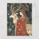 Bilden skildrar en förtjusande scen med en kvinna klädd i en porrerad, krimson cloak försedd med gyllene mönster. Hennes långa bruna hår är elegant formaterat, med blommigt- och bandaccenter. Hon vidrör försiktigt en hjort med besvärliga, märkliga antenner, dekorerade med prydnadsföremål. Snöflingor och stjärnan mönster omger dem och framkallar en magisk vinatmosfär. Bilden blandar en mystisk, sagolliknande charm med en julhelg ambians, med ett känsligt, illustrativt stil.