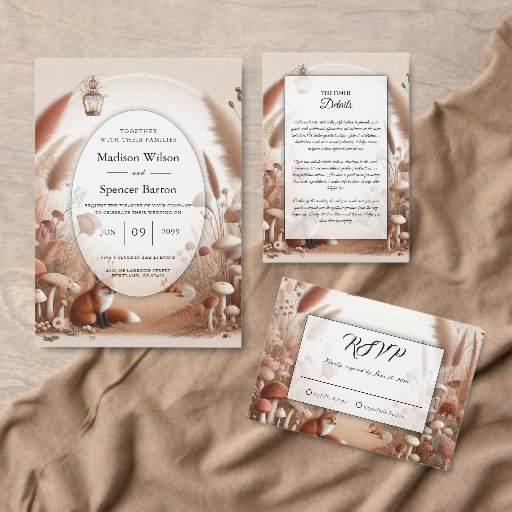 Träd in i en sagoskog där gyllene gräs vajar, vilda svampar blommar och nyfikna rävar håller vakt under en mjukt lysande lykta. Denna fantasifulla skogsinbjudan är perfekt för par som älskar naturen, romantiken och en touch av magisk charm. Med sina varma, jordnära toner och fridfulla miljö är den idealisk för höst- eller utomhusbröllop. Anpassa med dina evenemangsuppgifter och skapa tonen för en verkligt förtrollande fest.