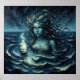 Denna fantasyaffisch visar en mystisk havsgudinna med flödande hår som håller en lysande flaska mitt i virvlande havsvågor, symboliserar mystik, kraft och naturens förtrollande kraft.
