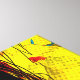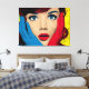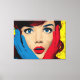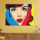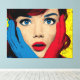 En kvinna med rött hår och livfulla blå ögon täcker ansiktet med handskar. Bakgrunden är ljus med influenser från popkonst.