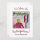 Att förutse julhälsningskort som du kan anpassa med din egen familj bild. En liten blond pojke med röda sliprar tittar upp skorsten i väntan på att han kommer med presenter och gåvor... Fireplace är dekorerad med sina röda lager och rött och grönt hollagland