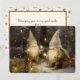 Den här förtrollande julkortet fångar en tyst vintermagi, med två skäggiga tomtar iförda höga, spetsiga vita hattar, inklämda i en snöig, skymningsfärgad skog. Den klassiska, måleriska stilen frammanar det fantasifulla paret som lyser upp mörkret genom att hålla i och koppla upp varma, vintageinspirerade glödlampor som sprider ett varmt, gyllene sken mot de svala, blågrå trädstammarna. Kontrasten mellan den frostiga, tysta skogen och det inbjudande ljusskenet skapar en hjärtlig stämning av frid och förberedelser för högtiden, perfekt för att dela ett budskap om hopp och förundran under den här årstiden.