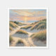 Vattenfärgade fotavtryck i strandsanddyner med pampasgräs soluppgång över havet