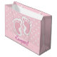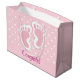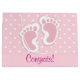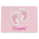 Giftpåsar med en bra bild av fotavtrycken i rosa flicka med en tung vit kontur. Vit polka dots på en rosa bakgrund bakom illustrationen.