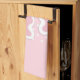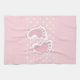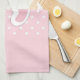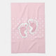 Kökshandduk med en fin bild av fotavtryck från rosa flicka med en vit kontur. Vit polka dots på en rosa bakgrund bakom illustrationen.