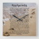 Den här väggklockan visar fotavtryckets dikt i ett unikt tryckteckensnitt med svart brev placerat över en strand med avtryck i sanden. Den här klockan är gjord för valfri vägg och tryckt med ett processaa mått för AcryliPrint®HD på 10,75 x 10,75 tum och tillverkad av klass-A-akrylat. Batteridrivna användor ett AA-batteri endast för inomhusanvända, rekommenderas inte för använda utomhus.