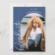 Lägg till ditt favoritfoto på framsidan av dessa blåa inbjudningar till studentfesten som innehåller ord student i chic med text tillsammans med ditt namn och klassår. Dina uppgifter om party finns på baksidan. MERA design och färg i vår butik, inklusive tillkännagivande för studenten, spara datumkort och vykort.