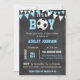 Imponera dina gäster med dessa älskvärt det är inbjudningar för en baby shower för pojkefotbolltema. Baby blue vit på svart tavlabakgrund. Perfekt för den pojkebaby shower. Redigerbara mallinbjudningar. Tillfoga din information.