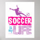 Den färgstarka flickans fotboll poster med texten "SOCCER är mitt liv". Det har en fotbollsspelare som spelar silhuette och sparkar en fotboll ovanför texten. ©gollygirls.com