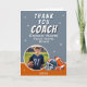Fotboll Boll Hjälm Tecknad Tränare Foto Tack Kort. Visa din uppskattning med detta roliga och hjärtliga fotboll tack-kort designat speciellt för tränare! Med en djärv tecknad illustration av en fotboll och hjälm i orange och grått är detta kort perfekt för ungdomslag eller individuella spelare. Bra för säsongsfinalens presenter eller bara för att tacka en inspirerande tränare. Lägg till ditt foto och meddelande inuti eller sudda ut det.