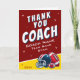 Fotboll Boll Hjälm Tecknad Tränare Tack Kort. Visa din uppskattning med detta roliga och hjärtliga fotboll tack-kort designat speciellt för tränare! Med en djärv tecknad illustration av en fotboll och hjälm i rött, guld och vitt är detta kort perfekt för ungdomslag eller individuella spelare. Bra för säsongsfinalens presenter eller bara för att tacka en inspirerande tränare. Lägg till ditt meddelande inuti eller sudda ut det.