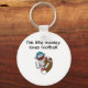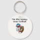 En fotbollsdesign i sock monkey på fotbollens T-shirts, kort, mugg, tote bags, klistermärken, nyckelkedjor och andra artiklar med en sock monkey-fotbollsspelare och stil-text som lyder "Denna lilla apa-kärlek-fotboll!".