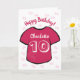Personlig-flickans 10-årskort med rosa fotbolls-/fotbojskjorta. Den design som visas är för ett barn som firar sin tioårsdag. Kortet kan anpassas till vilken ålder som helst, liksom namn i namn och ditt eget budskap.