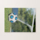 Den blå och vita fotboll på gräs väntar på att sparkas. Fotot med hög upplösning skapar en intressant fotboll påstående för fotboll älskare. Anpassa genom att lägga till eller ändra namn. Teckensnittet kan ändras på storlek, stil, färg eller plats.