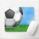Nära övre illustration av en fotboll som vilar på ett fält av gräs. Bollen är den designade lowen till det slipat. Det finns också utrymme i himmlen som tillfogar ett textmeddelande, om du önskar till. Avbilda tillgängligt på olika gåvor och produkter.