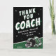 Fotbollshjälm Cartoon Tränare Tacksamhetskort. Visa din uppskattning med detta roliga och hjärtliga tacksamhetskort designat speciellt för tränare! Med en djärv cartoon-illustration av en fotboll och hjälm i grönt, svart och vitt är detta kort perfekt för ungdomslag eller individuella spelare. Bra för säsongsavslutande presenter eller bara för att tacka en inspirerande tränare. Lägg till ditt meddelande inuti eller sudda ut det.