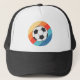 Abstrakt grunge retro stil illustration av en fotboll på strimlad gult, orange, rött, turkos och mörk blått återgångsbakgrund för alla som tycker om fotboll. Det är lätt att ändra bakgrunden till färg och anpassa den.