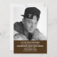 Idrottstemat tonåring fotoannonsering av pojken studenten och ett öppet hus. Brun med vit text och ett stort fotomallområde. Hans namn, skola och klass står under fotot tillsammans med firande. En mönster av fotbollar och basebollar täcker baksidan av pappra.