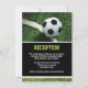 Denna fotbollstematiska Bar Mitzvah-mottagning eller festkort koordinerar med Bar Mitzvah-inbjudan Night Stadium. Den har ett band av grönt gräs längs med över- och underkanten på kortet med en svart-vit fotboll på den vitmålade linjen vid hörnet av en bakgrundsbild av en fotbollsplan. Det finns ett svart-vitt område för att skriva ut dina festdetaljer nedanför fotbollen. Detta fotbollsmottagningskort har en blandning av grön och vit text i typsnitt som matchar inbjudan och baksidan är grön med en blek Davidstjärna på den med en ytterligare textruta ifall du behöver lägga till någon annan information. Ta bort orden där om du inte behöver dem.