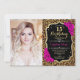 Leopard mönster 15:e födelsedagsfest inbjudan med ditt foto. Innehåller cheetah-utskrift, skriptteckensnitt, shock rosa fuchsia ro och konetti. Konstruktion av djurförsök med faux glitter guld. Perfekt för en elegant på femtonde dagen firande.