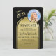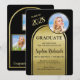Denna eleganta examensfestinbjudan har en dubbelbåge med svart text mot en penslad guld bakgrund och ett fält för ett foto av festens hedersgäst. Baksidan av kortet har plats för ytterligare tre foton. Mycket att anpassa för att passa din hedersgäst. Om du har några designfrågor är det bara att chatta eller mejla charmdesignstudio@rcn.com, så hjälper vi dig gärna. Kontakta oss också om du önskar att bakgrundsfärgen ändras till skolans färg eller en favoritfärg.