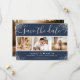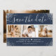 Fotot från den moderna marinen anpassningsbar blått och silver bröllop sparar datumkortet med ett typsnitt för elegant och ett fotokollage på en marin blå bakgrund som läggs till med silver konetti. Anpassa detta kort enkelt med information om bilder och bröllop, inklusive en webbplats för bröllop om tillämpligt.
