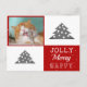 Cute Cat Pet Typography Julgran Photo Helgdag Postcard. Röd och vit bakgrund med snöflingor och ett enkelt Julgran. White Merry, Lycklig, Jolly typography. Designen har ett foto av en anpassningsbar av en katt - lägg i din favoritkatt eller något annat foto av ett sällskapsdjur i mallen och gör ditt personliga julkort till unikt.