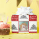 Papper omformning av foto från Julgran i kallt katt. Röd och vit bakgrund med snöflingor och ett enkelt Julgran. White Merry, Lycklig, Jolly typography. Designen har ett foto av en anpassningsbar av en katt - lägg i din favoritkatt eller något annat foto av ett sällskapsdjur i mallen och gör din personliga julklapp till en unik.