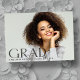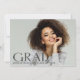 Moderna och djärva "Photo" studenten-annonskort, med inslag av mörk som färgade genomskinlig text från mode stil med texten "GRAD", tillsammans med en minimalistisk typografi. Bilden från student på kortets framsida visar hela yta. Kortets baksida ger personlig textutrymmen för information om studenten och framtida resor. Perfekt för högstadiet, högskolan och universiteten grad student.