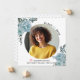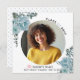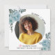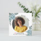 Fotoannonsering i Dusty blåa blommor 2023 studenten. En söt som visar ett foto, dammiga blåa vattenfärgblommor längst upp till lämnat och grund höger, texten "Klass 2023" och en rosa studentmössa. Baksidan innehåller en polka punkt mönster i dammblått och vitt.