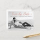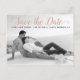 Modern damstig ro-skript, bröllop spara datum-fotovykort. Den här contemporaryns typografi Spara datumsymbolen innehåller ett svartvitt foto av paret och texten "Spara datumet" i ett modernt skriptteckensnitt.