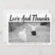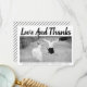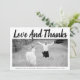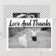 Foto på fetstil i Bröllop Tack med texten "Kärlek och tack". På baksidan finns ett diagonalt mönster med rastrerat, svart och vitt rand och ditt foto.