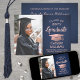 Meddela högskoleexamen eller högskoleexamen och inbjudan familj och vänner att fira med inbjudningar från anpassningsbarnas fotomarin, blått och rosa. Bild och formuleringar är enkla att anpassa och färg är lätta att ändra med Zazzle-konstruktionen verktyg. Den här hämtningsbara mallen är konfigurerad som ett kombinationsmeddelande och en gruppinbjudan som kan anpassas med valfri information, t.ex. föräldrars namn, speciella hedersbetygelser, graderingstitel, favoritcitat för inspiration, framtida student-planer eller nya adress. Utformningen har en marin blå bakgrund, faux ro guld pantarplock, elegant modern kalligrafi, klassisk vintage typografi och ett favoritfoto, t.ex. ett överordnat bild eller en bild från startceremonin. Observera att ro guld är tryckt på rosa färg, inte metallfolie. Detta utskrivbara studenten-kort är ett snyggt för att tillkännage en speciell dag i firande. Grattisar till student!