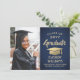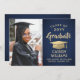 Meddela högskoleexamen eller högskoleexamen och inbjudan familj och vänner att fira med inbjudningar från anpassningsbarnas fotomarin blått och guld. Bild och formuleringar är enkla att anpassa och färg är lätta att ändra med Zazzle-konstruktionen verktyg. Den här hämtningsbara mallen är konfigurerad som ett kombinationsmeddelande och en gruppinbjudan som kan anpassas med valfri information, t.ex. föräldrars namn, speciella hedersbetygelser, graderingstitel, favoritcitat för inspiration, framtida student-planer eller nya adress. Utformningen har en marin blå bakgrund, en faux foil mortar board, modern kalligrafi av eleganten, klassisk vintage typografi och ett favoritfoto, t.ex. ett överordnat bild eller en bild från startceremonin. Observera att guld är tryckt på färg, inte metallfolie. Detta utskrivbara studenten-kort är ett snyggt för att tillkännage en speciell dag i firande. Grattisar till student!